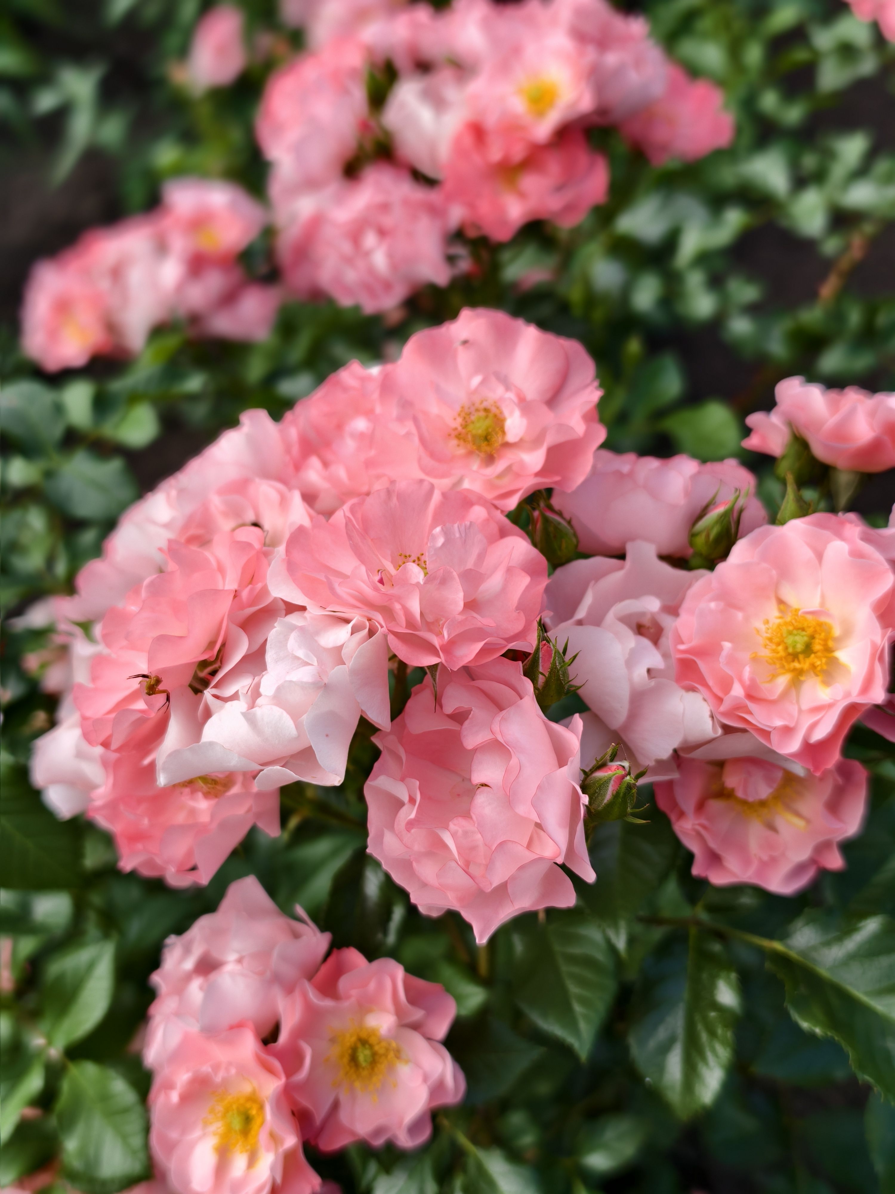 Нежно-розовые, полу-махровые цветы, с более светлым центром. Непрерывное цветение в течение всего сезона. Куст вертикальный. Темно-зеленая, глянцевая листва.