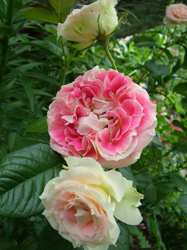 Широкие, очень сильно волнистые лепестки свернуты в центре цветка, так что темно-розовая внешняя сторона лепестков красиво контрастирует с нежно-абрикосовым реверсом. Цветки быстро раскрываются, они густомахровые и округлой формы, но почти никогда не показывают серединку. Лучше всего сорт показывает себя в теплых, сухих условиях. Желтый оттенок со временем выгорает, так что более старые цветки становятся бело-розовыми. Куст достигает 2 м при выращивании кустом, но побеги склоняются под весом кистей цветков ( в кистях обычно 3-9 шт), та что лучше выращивать эту розу на опоре. Листва устойчива к заболеваниям.